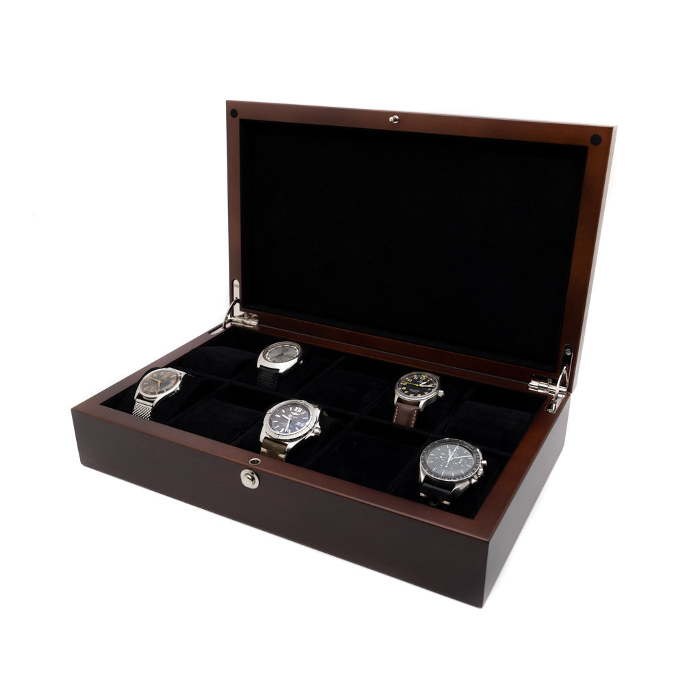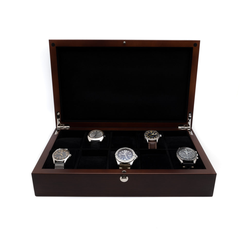Tyylikäs Becon mattapintainen kellolaatikko kymmenelle kellolle. Valmistettu aidosta pähkinäpuusta. Sisäpinta mustaa samettia, joka suojaa kellosi naarmuilta. Toimitus noin 1 viikkoa tilauksesta.