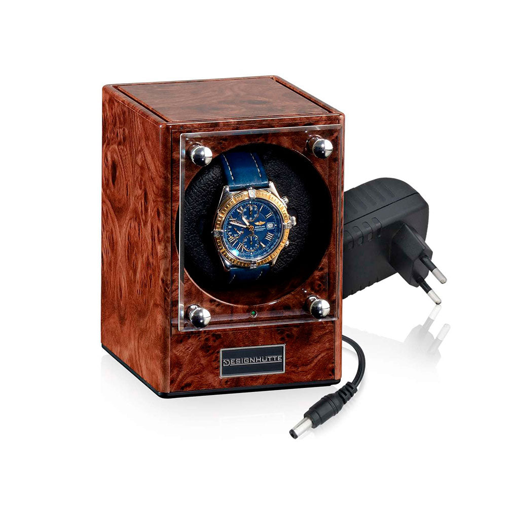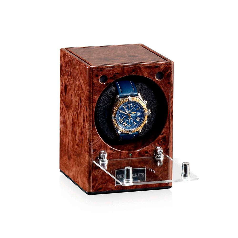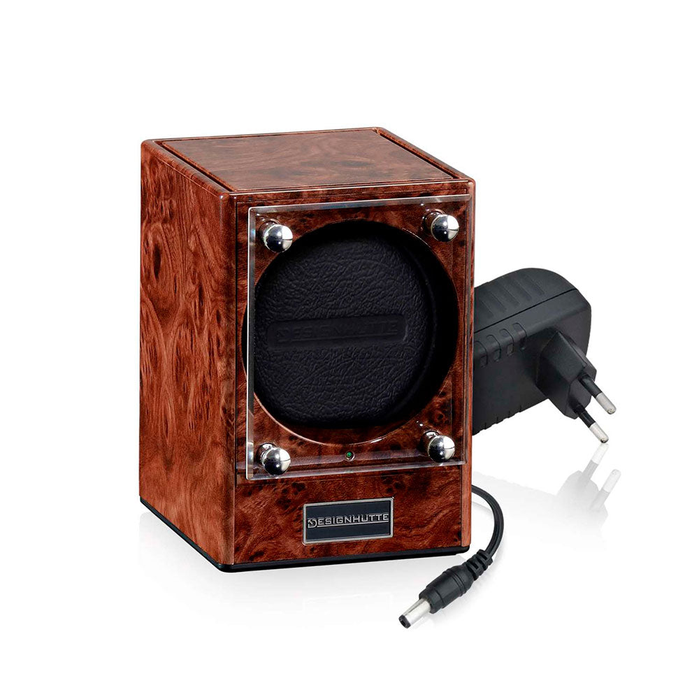 Designhutten kellonpyörittäjä Piccolo on yhdelle kellolle suunniteltu moduläärinen pyörittäjä. Piccoloita on mahdollista kytkeä sarjaan yhteensä neljän pyörittäjän verran. Hienoa on se, että et tarvitse mitään erillisiä kaapeleita siihen. Heti kun ensimmäinen kellonpyörittäjä on kytketty virtalähteeseen, riittää, että seuraavat pyörittäjät asetetaan sen päälle tai viereen. Ikään kuin taianomaisesti, muut pyörittäjät aloittavat pyörimisen. Takaosan kahden säätimen avulla voidaan säätää yhteensä 12 erilaista ohjelmaa. Piccoloa ohjaa voimakas Mabuchin moottori, joka jaksaa pyörittää jopa 250 gramman kelloa ongelmitta.| Tuotetyyppi | Kellonpyörittäjä |