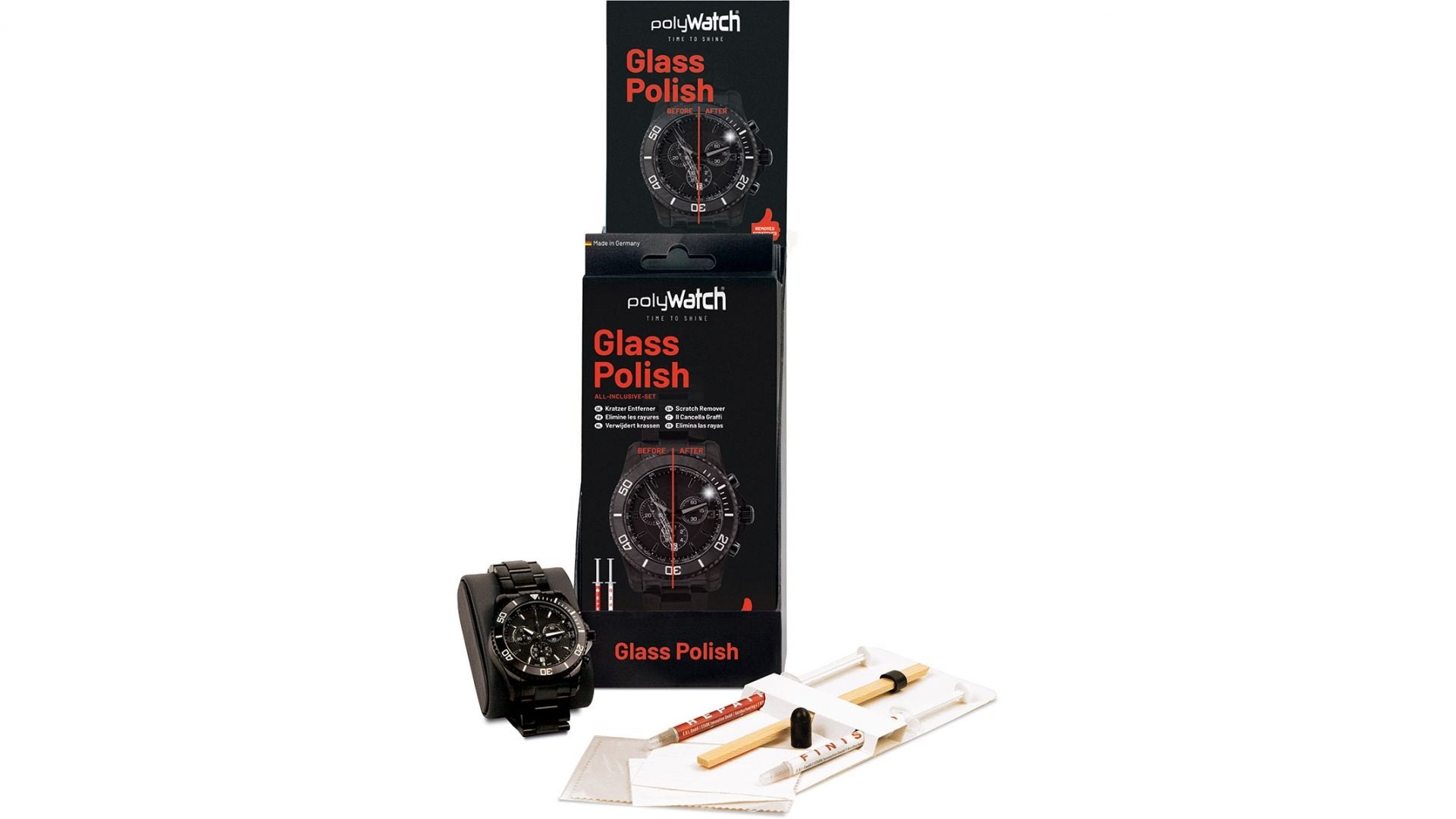 PolyWatch Glass Polish on suunniteltu kellon lasin (safiiri, akryyli) kiillottamiseen. Polywatch käsittelyllä palautat kellon lasikkeen takaisin uudenveroiseksi. Kiillottaa pienet ja keskisuuret naarmut pois ja taas näkyy!