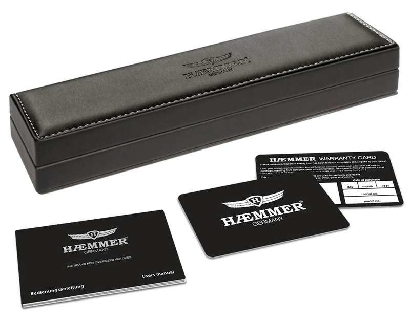 Saksalainen Haemmer-kello on helposti tunnistettavissa. Miesten kokoelman kellot ovat tyypillisesti 50 mm halkaisijaltaan, joissa on kruunu vasemmalla puolella. Ruostumattomasta teräksestä tehdyt kellot ovat Limited edition-malleja, joissa on jokaisessa kelloissa kellon oma sarjanumero kaiverrettuna. Tarkkuudesta vastaa laadukkaat Miyotan kvartsi- ja mekaaniset koneistot. Vesitiiviit kellot ovat varustettu lumeella ja rannekkeet ovat korkealaatuista vasikan nahkaa.
