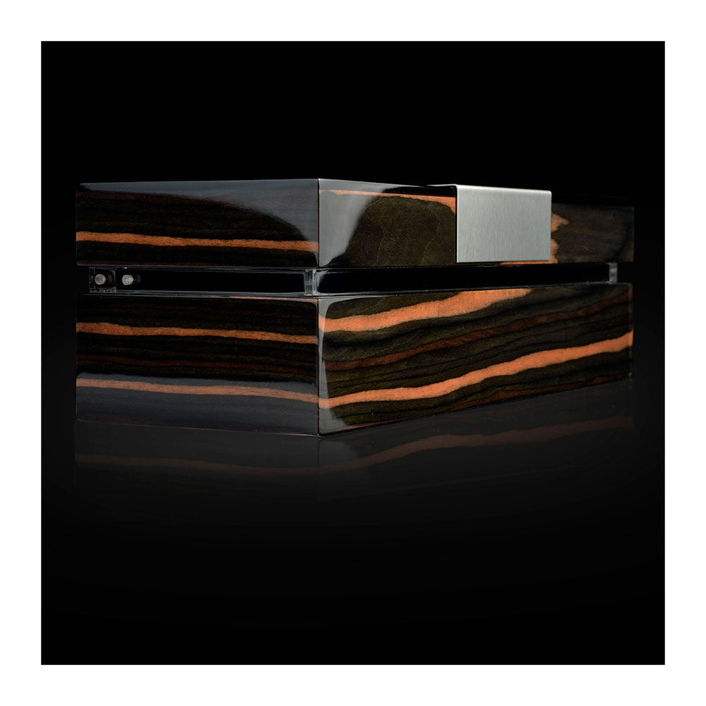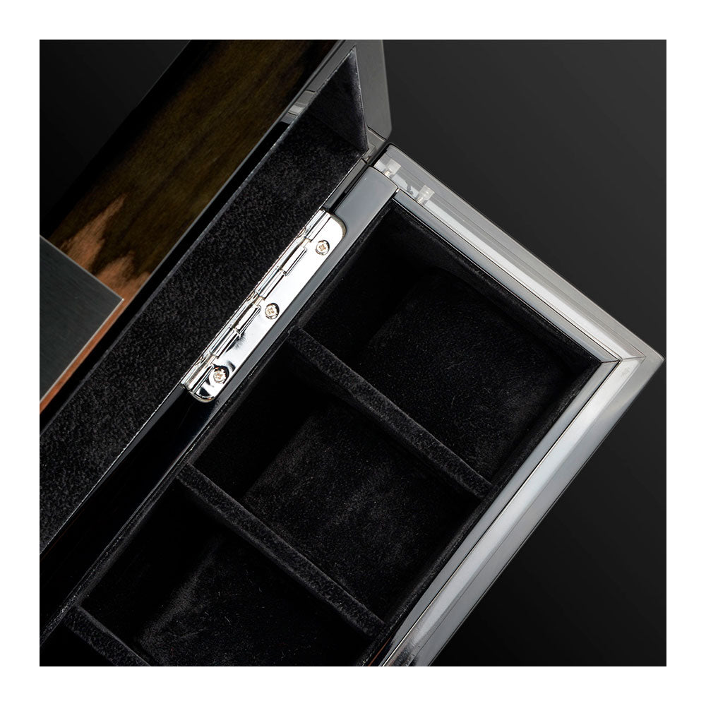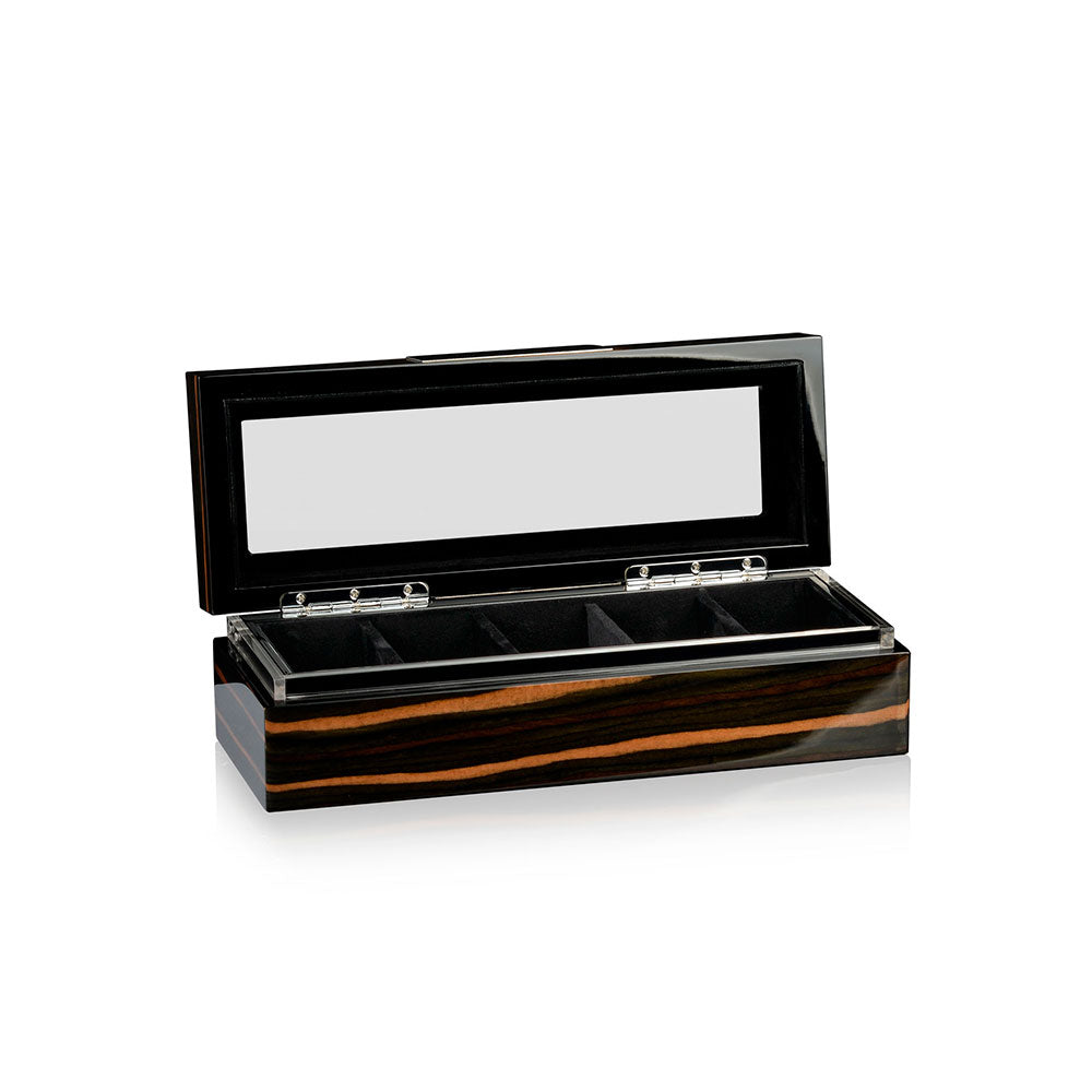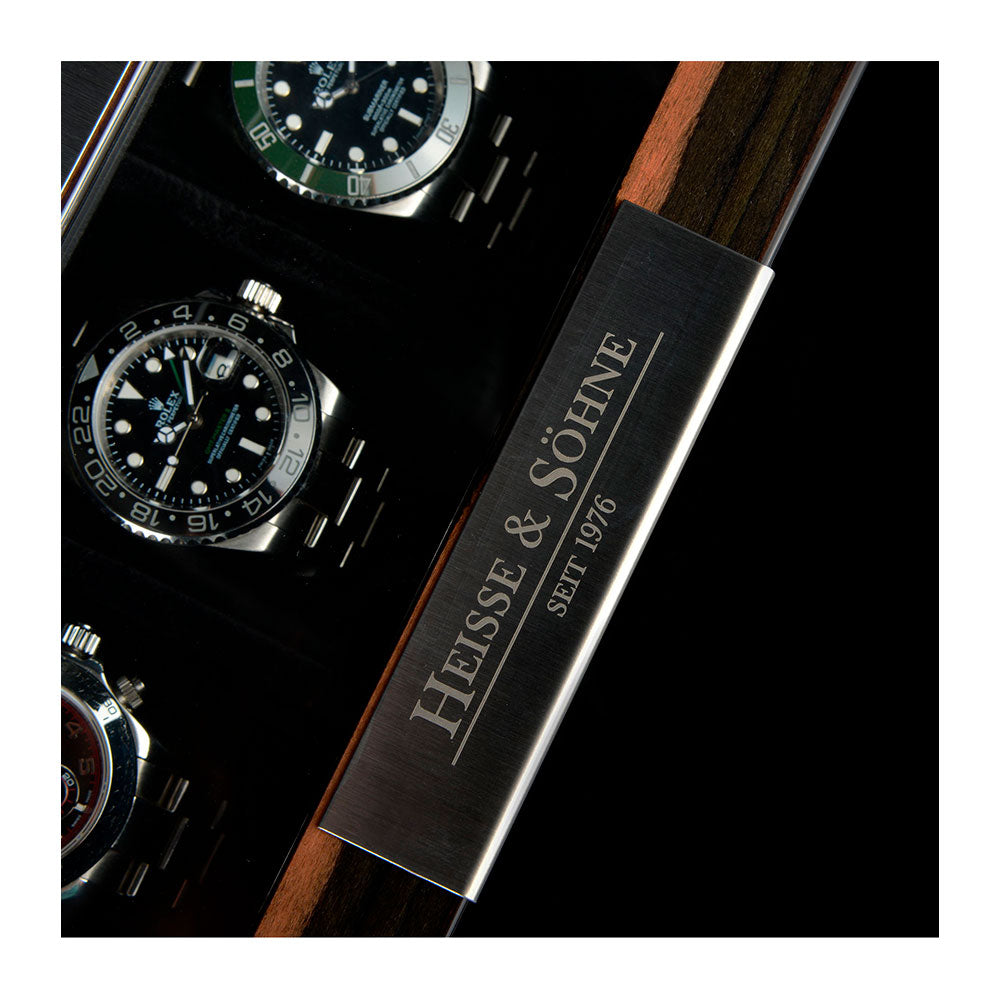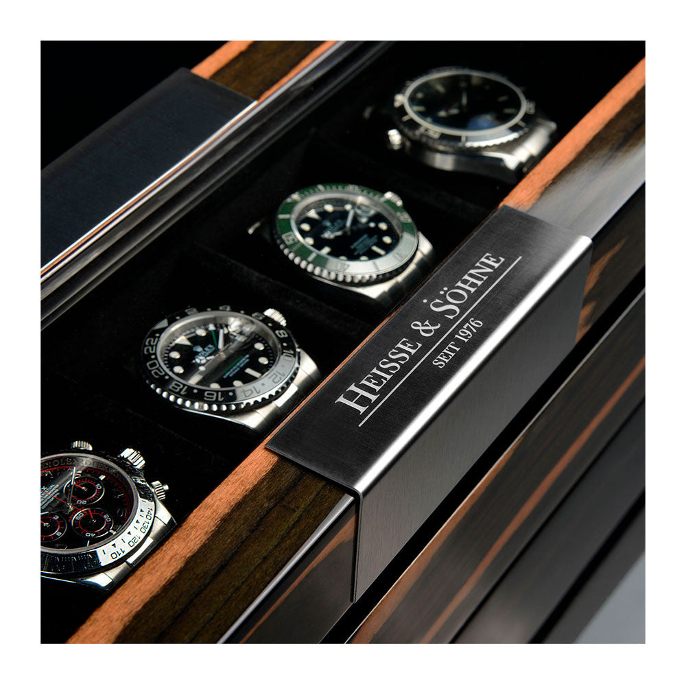 Heisse & Söhne executive-sarjan laadukas kellolaatikko viidelle kellolle. Valmistettu puusta ja alumiinista. Sisusta mustaa samettista materiaalia, joka suojaa kellosi naarmuilta. Boksissa on ikkuna, josta pystyt ihailemaan kellojasi ilman sen suurempaa eforttia!| Tuotetyyppi | Kellolaatikko |