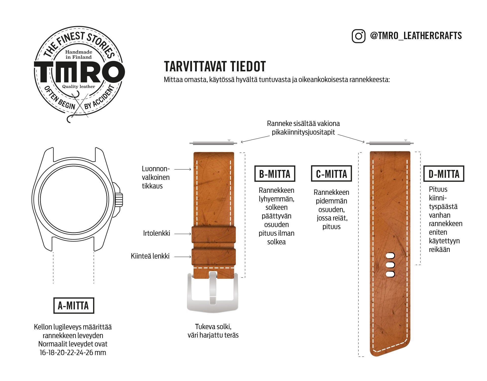 Huomioithan että mittatilaustuotteella ei ole palautus- tai vaihto-oikeutta, joten mittaa huolella rannekkeen mitat ennen tilaamista. Rannekkeet valmistaa 100 % käsityönä TMRO Leathercrafts Littoisten Verkatehtaalla, Suomessa.