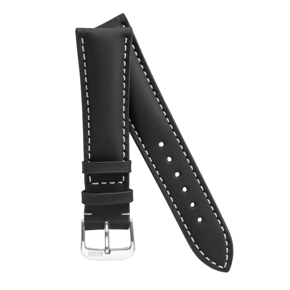 Rios1931 Polo - vedenkestävä nahkaranneke, jossa kumipinnoite ja valkoiset tikkaukset. Rannekkeen paksuus ohenee solkea kohden. Solki valmistettu nikkelivapaasta ruostumattomasta teräksestä. Saatavilla eri väreissä.- Pitkä osa 114mm, lyhyt osa 82mm