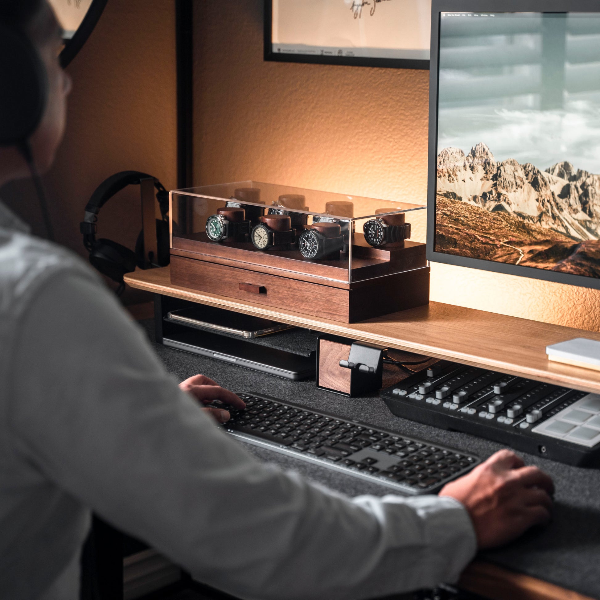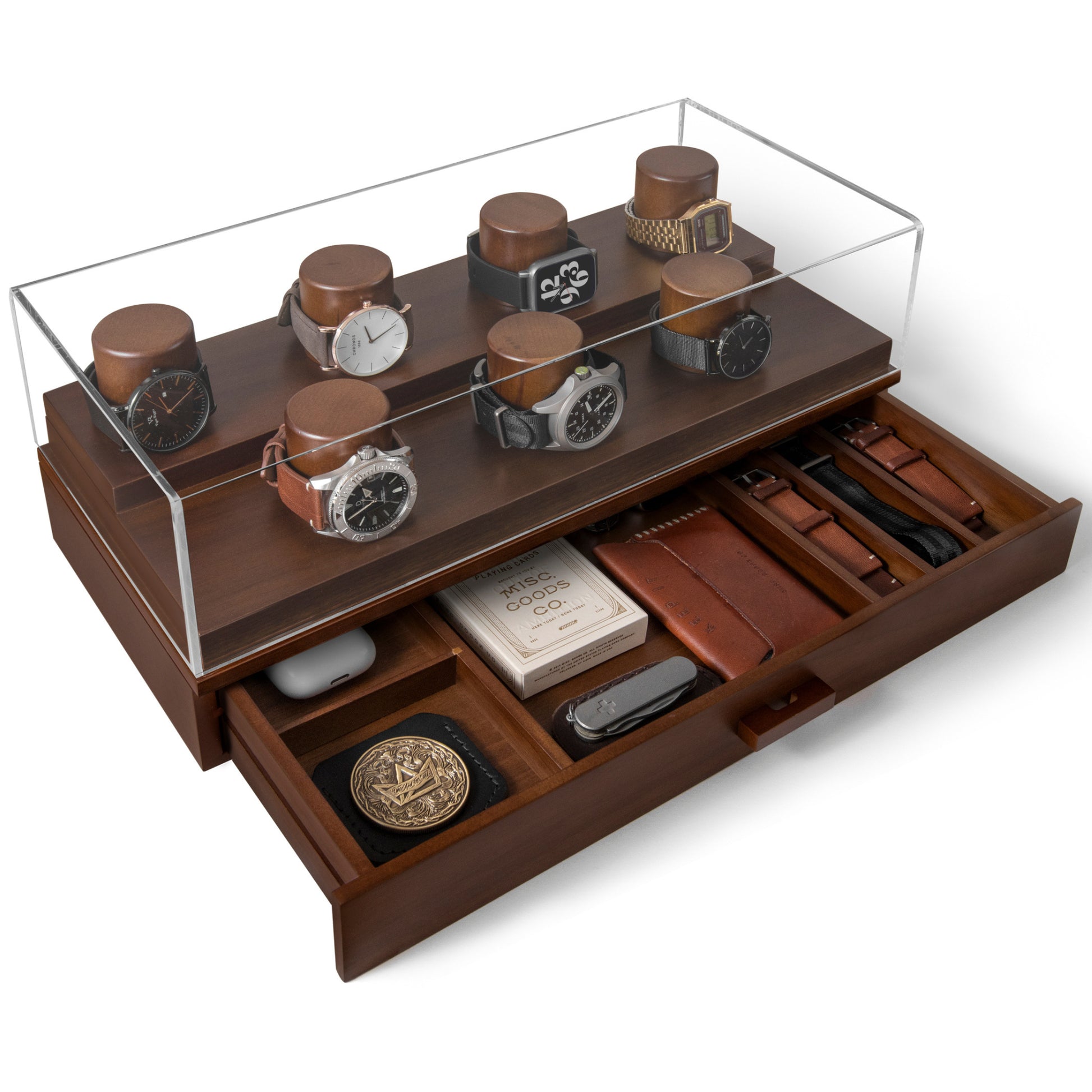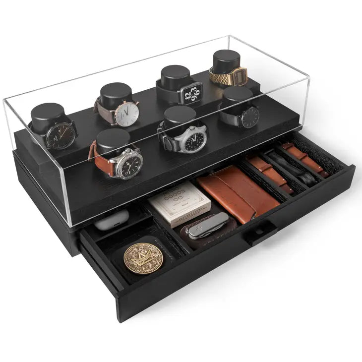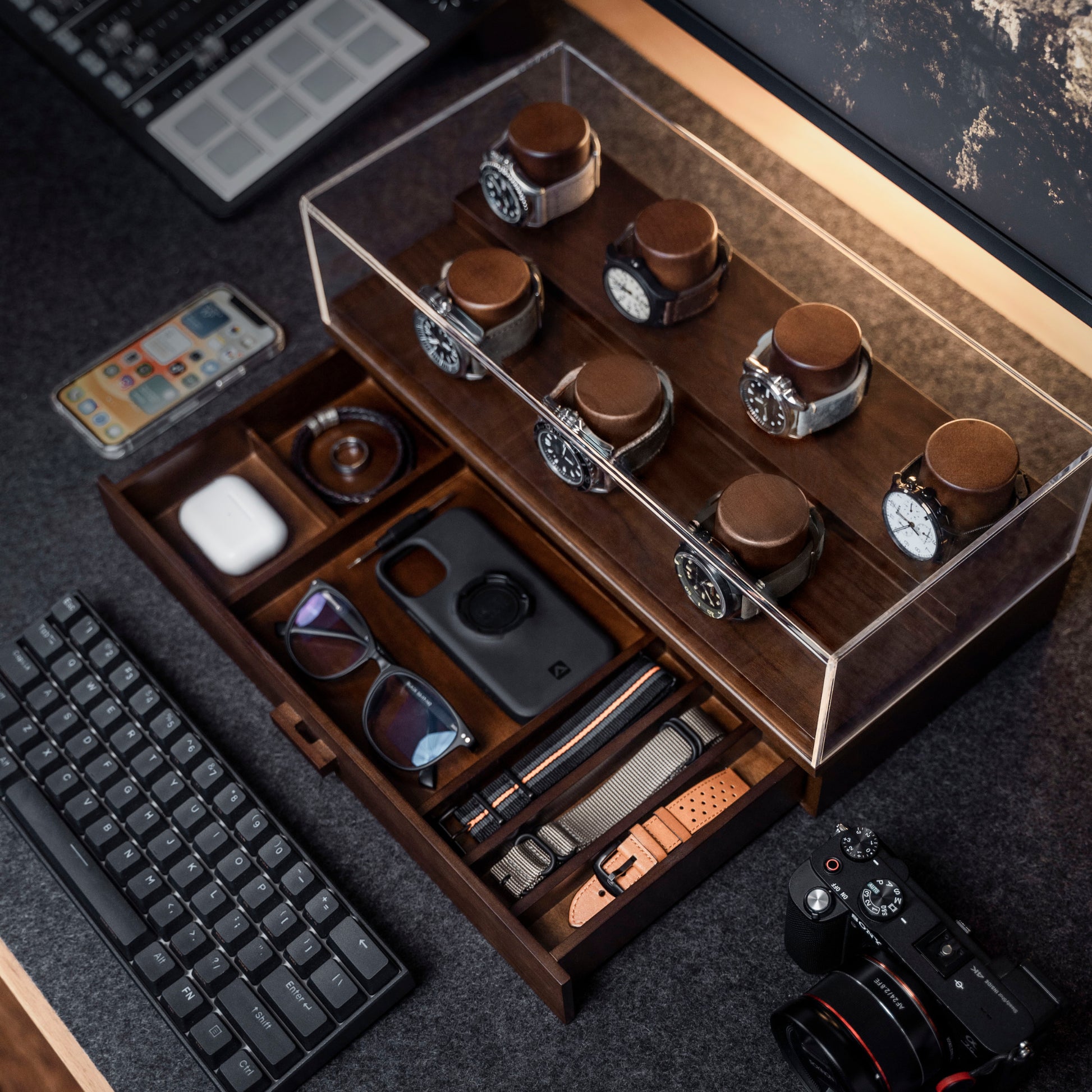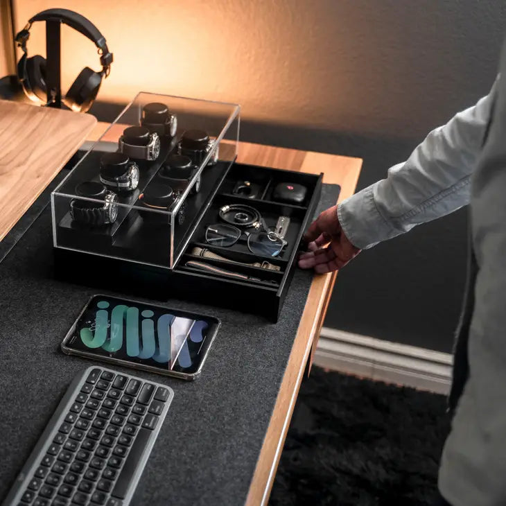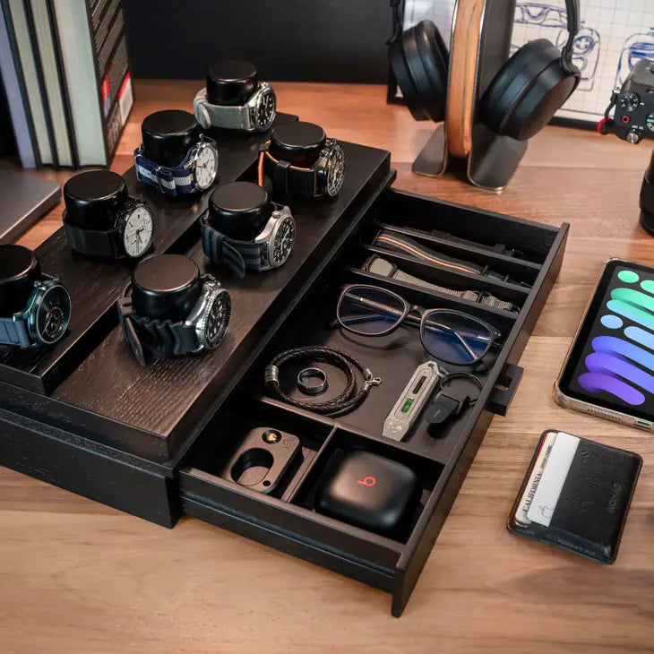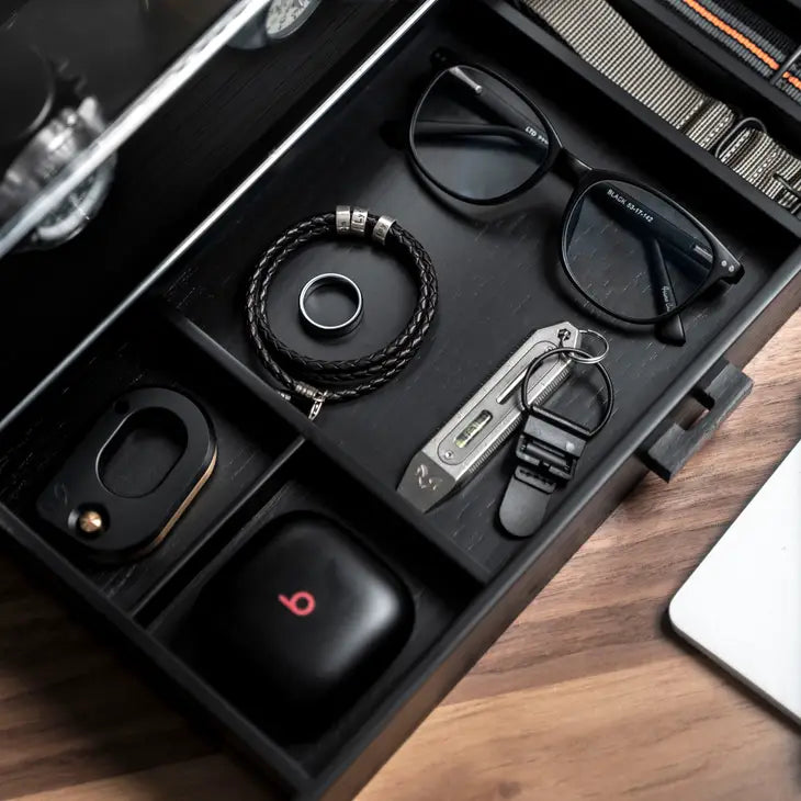 Holme & Hadfield lähestyi kelloboksien tekemistä vähän eri kantilta ja halusi, että hienot aikaraudat ovat kauniisti esillä, mutta myös rannekkeet, EDC-kamat ja työkalut mahtuvat samaan boksiin.